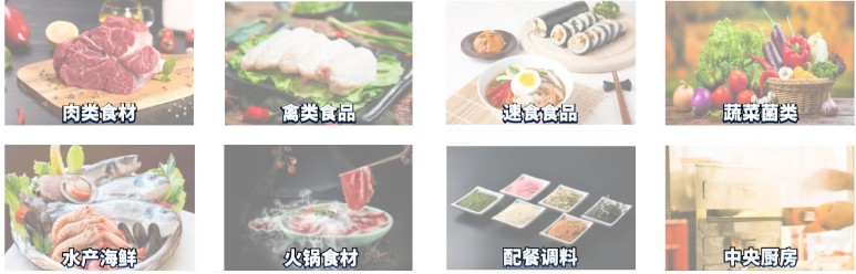 火鍋食材:湯料、火鍋底料、調料、蘸料、火鍋調理制品及魚糜制品、速凍米面制品、裹面制品、菜肴制品、果蔬制品、燒烤制品等;