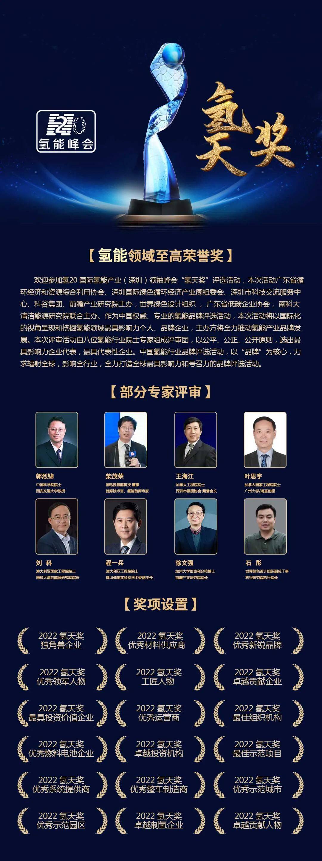 為推動中國氫能產業高質量發展,大會組委會聯合政府機構、相關院士、專家、權威媒體舉辦:“氫20”全球“氫天獎”評選活動,旨在表彰氫能產業發展建設中做出突出卓越貢獻的企業、個人、產品、技術、模式與應用。