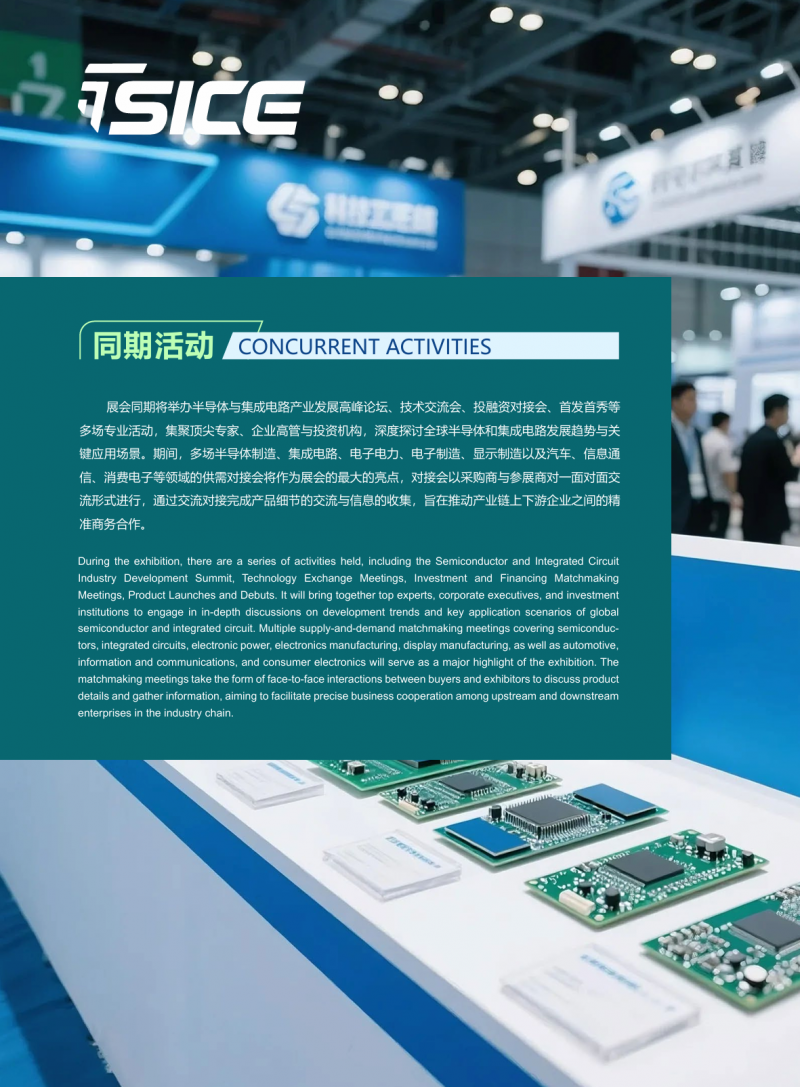 展會同期將舉辦半導體與集成電路產業發展高峰論壇、技術交流會、首發首秀等多場專業活動,集聚專家、企業高管,深度探討全球半導體和集成電路發展趨勢與關鍵應用場景。期間,多場半導體制造、集成電路、電子電力、電子制造、顯示制造以及汽車、信息通信、消費電子等領域的供需對接會將作為展會的最大亮點,對接會以采購商與參展商面對面交流形式進行,通過交流對接完成產品細節的交流與信息的收集,旨在推動產業鏈上下游企業之間的精準商務合作。
